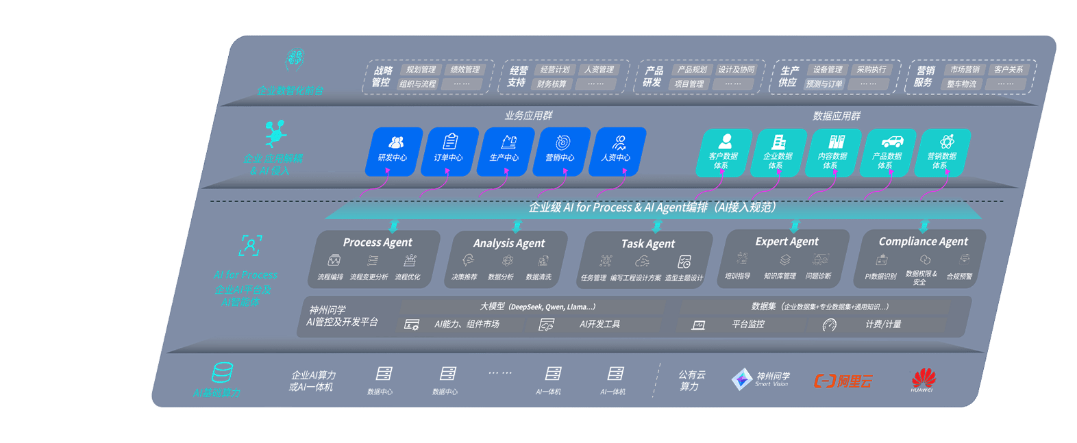 端到端的一站式AI工作空间深度融合了从企业战略规划到日常经营的全流程业务板块,,定向解决车企内部领域多、、、部门多、、、、链条长、、、、场景碎片化等难题,,,支持车企快速构建以AI为核心的生产力写作体系,,实现任务执行与AI能力的无缝集成与交互
