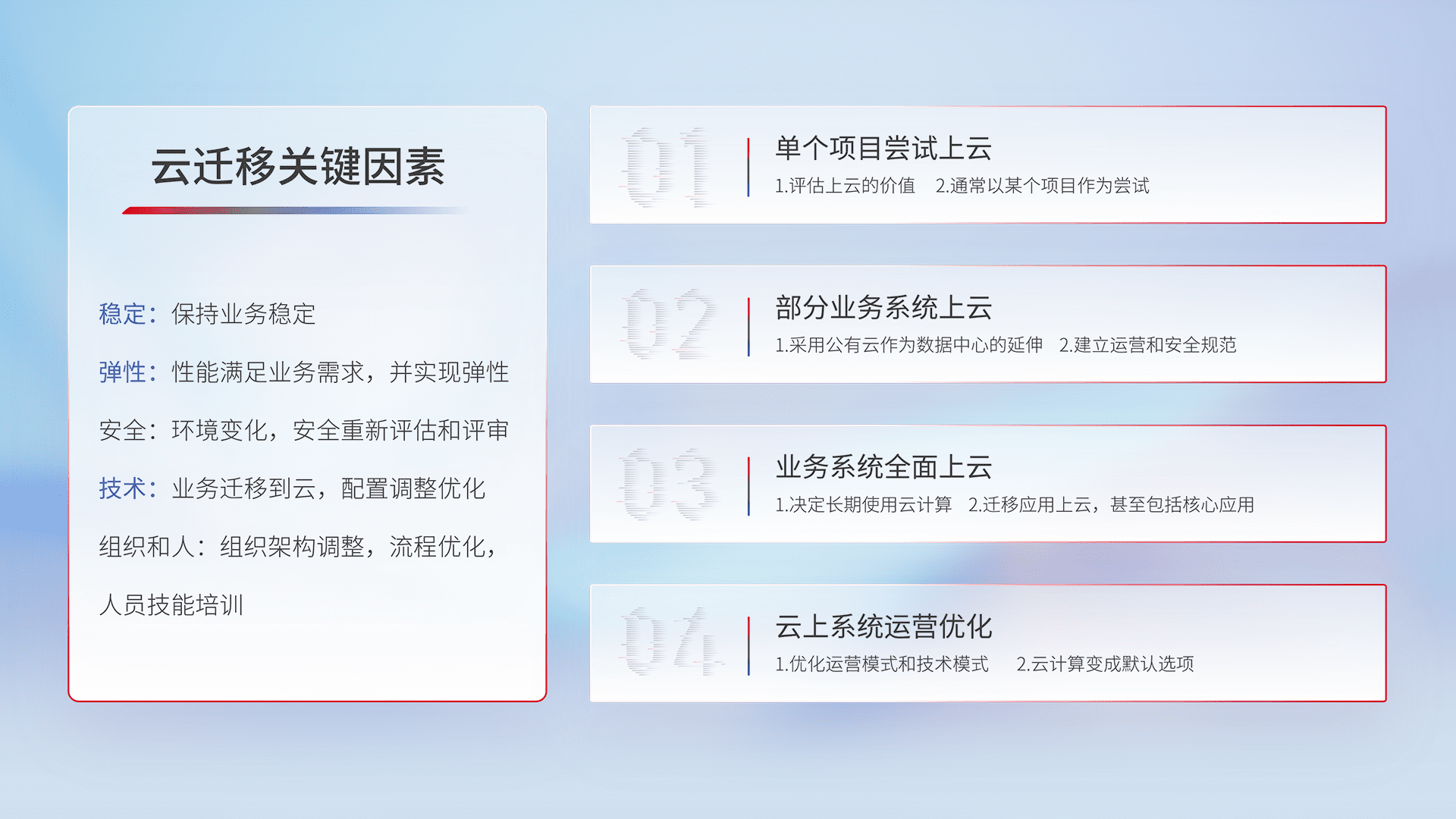 结合实际业务,,从规划设计、、、云平台选型、、、、云原生改造、、、数据迁移、、、、集成交付,,,迁移全过程为客户识别最佳上云路径,,做好风险识别管理,,,设计网络架构、、身份权限、、、、安全审计合规、、、、操作审计、、、日志审计、、、、监控告警策略、、多站点容灾设计等,,,对云上基础设施进行整体规划,,提升IT治理水平,,,,以满足弹性、、、高可用、、高性能的需求。。。。